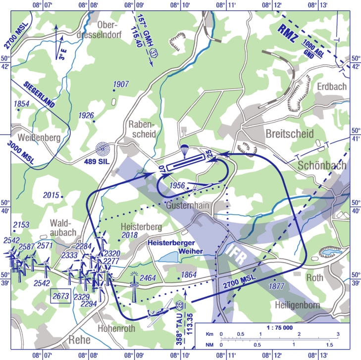 Bei IFR-Anflügen RWY 31 und IFR-Abflügen RWY 13 am Flughafen Siegerland kann der Platzrundenverkehr in Breitscheid vorübergehend eingeschränkt sein.